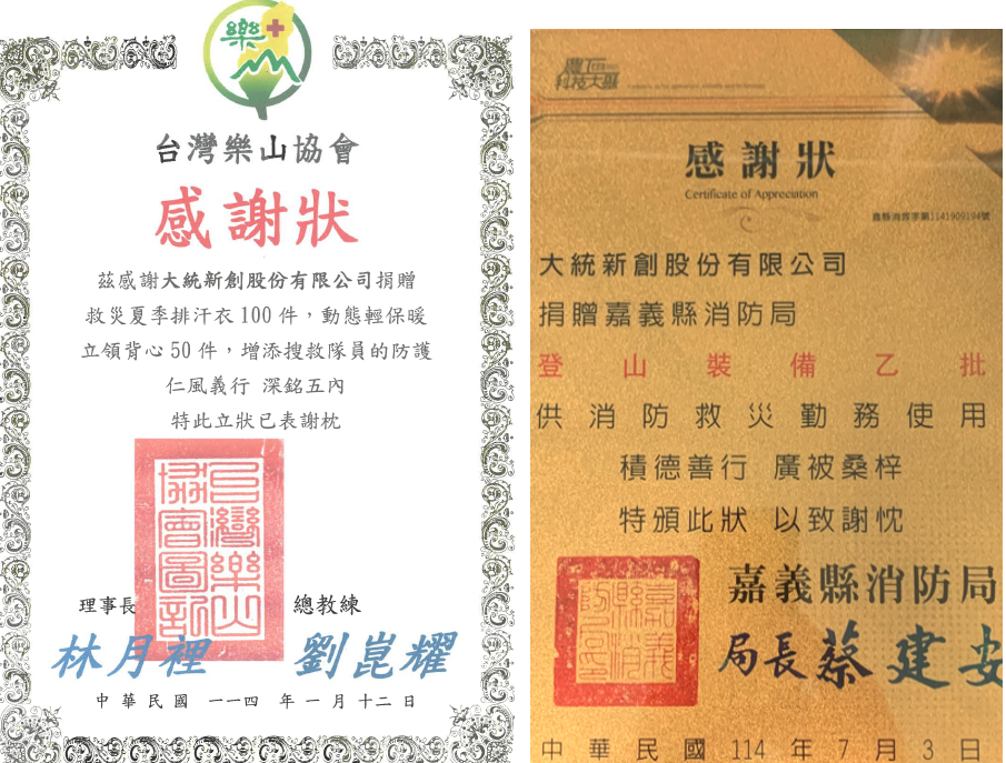 捐贈排汗衣、保暖背心共150件予台灣樂山協會;捐贈登山裝備一批予嘉義縣消防局,以實際物資支援第一線救難人員。